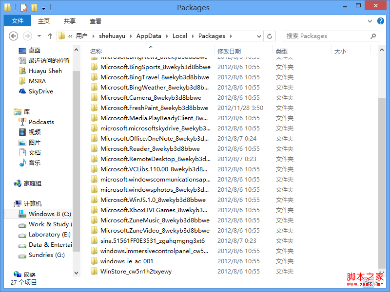 从图中可以看出,识别这些 App 究竟对应开始屏幕里面哪个 Modern App 其实并不难,因为文件夹的部分就是该程序的名称。例如我们可以看见最后一个,"WinStore_cw5n1h2txyewy",它无疑就是"应用商店"这个应用的内部名称。