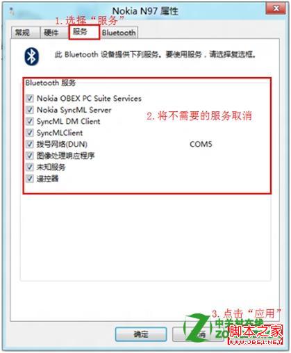 4、选择“服务”之后能够看到该设备支持的功能所需的所以服务,未安装的 Bluetooth 外围设备就是由于这些服务没有安装成功驱动导致,自行查找设备的蓝牙驱动安装后即可。或者使用下图中的方法,将部分功能的服务取消,之后即可不再显示在设备管理器中。