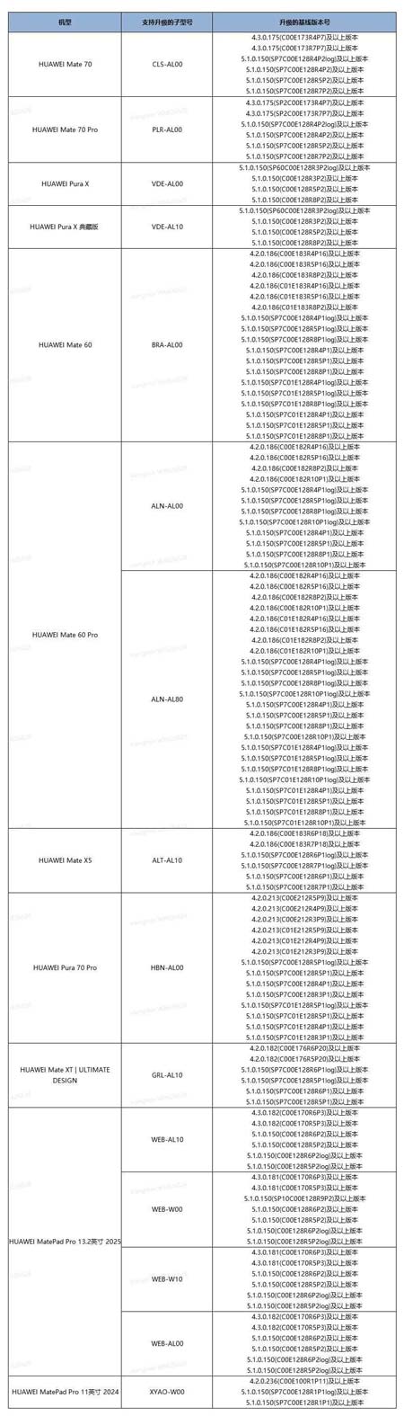 A:当前仅支持在中国大陆使用且在基线版本的以下机型:HUAWEI Mate 60、HUAWEI Mate 60 Pro、HUAWEI Mate 70、HUAWEI Mate 70 Pro、HUAWEI Mate X5、HUAWEI Mate XT | ULTIMATE DESIGN、HUAWEI Pura X、HUAWEI Pura X 典藏版、HUAWEI Pura 70 Pro、HUAWEI MatePad Pro 13.2 英寸 2025、HUAWEI MatePad Pro 11 英寸 2024。具体支持升级的机型及子型号详见“机型及基线版本清单”。不同产品的版本规划有所不同,其他机型升级计划请您关注后续华为官方消息。