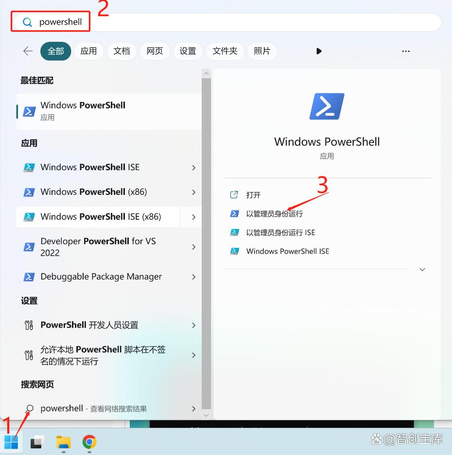 1、打开 PowerShell (不是 CMD). 搜索框输入PowerShell,然后打开