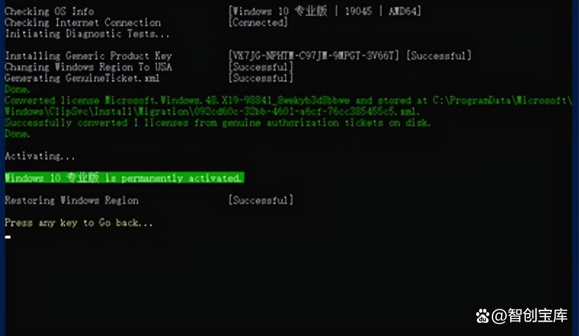 4、输入1激活windows系统,等待几分钟,耐心等待,出现以下界面代表激活成功了。