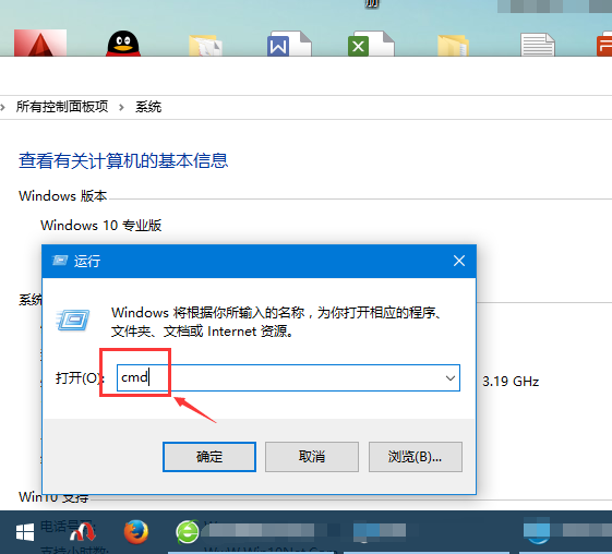 2、在弹出的运行窗口中,输入dos命令“cmd”,然后回车,如图所示