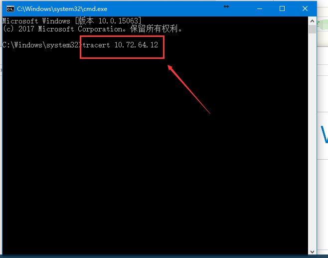 4、然后在追踪命令tracert后空一格,紧接着输入需要追踪的目的地址,比如“10.72.64.12”为例,然后回车