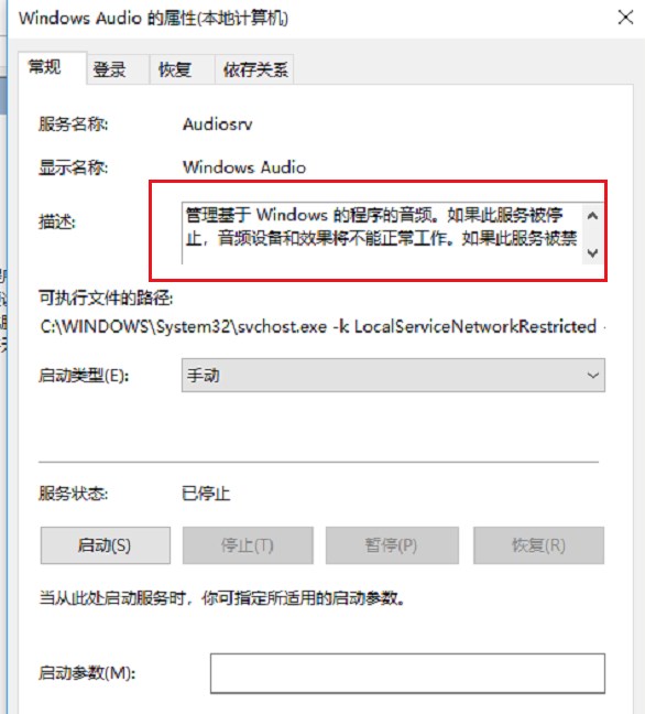 进去“Windows Audio”服务属性界面之后,可以看到这是音频设备和效果的服务,如下图所示:
