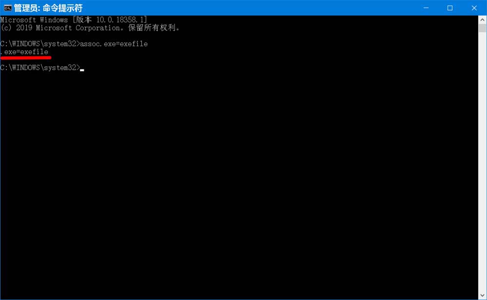 方法二:在管理员命令提示符窗口中执行assoc.exe=exefile命令,修复 Windows 10系统 exe File 打不开的错误。
