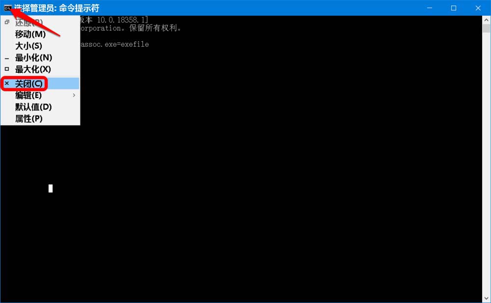 4、点击窗口左上角的小框,在下拉菜单中点击【关闭】,退出管理员命令提示符窗口。