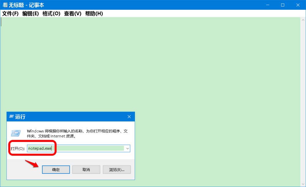 5、在运行对话框中输入:notepad.exe,点击确定或按下键盘上的回车键,应该可以打开记事本。