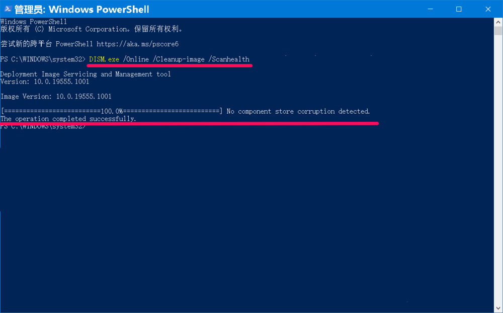 *** 如果问题还是没有解决,可在安全模式中将【命令提示符(管理员)】更换为【Windows PowerShell(管理员)】,操作完成后,显示:No component store corruption detected. The operation completed successfully.