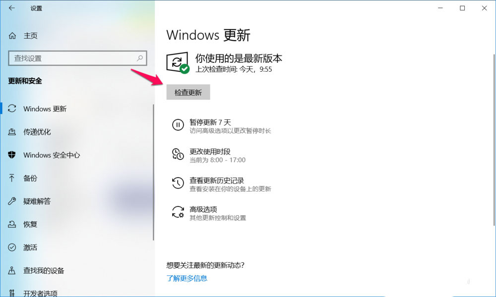 进入 设置 - Windows 设置 - 更新和安全 - Windows 更新,点击:检查更新;