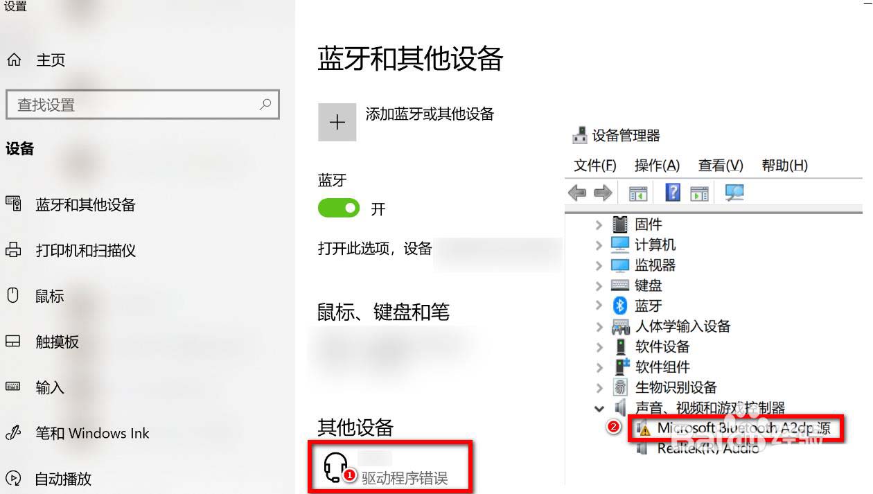 1、安装Windows 1903(RS6)的系统,升级最新的Windows补丁后,连接蓝牙音箱或耳机,可能出现提示“驱动程序错误”,或者连上后播放音乐,发现音乐音质差,设备管理器中发现“Microsoft Bluetooth A2dp源”设备,并且有黄色感叹号。具体问题如下图: