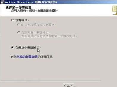 10、继续点击下一步,弹出 选择某一部署配置 对话框,选中 在新林中新建域,点击下一步,弹出 命名 林根域 对话框,在文本框中输入新林的根域。