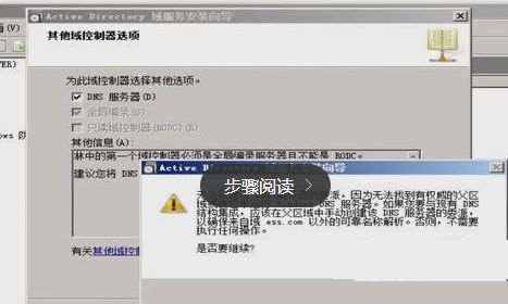 12、点击下一步,弹出 其他域控制器选项,显示其他域控选项,单击下一步,出现提示框,该DNS服务器是网络中第一个DNS服务器,因此,会提示无法创建该DNS服务器委派。