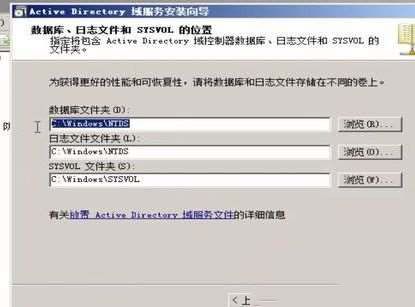 13、直接单击 是 按钮,弹出下图, 数据库 日志文件和SYSVOL的位置 对话框。建议用户将数据库、 日志文件和SYSVOL存储在不同的物理磁盘中,这样可以获得更好的性能和可恢复性。