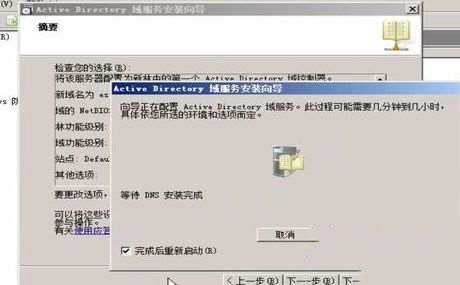 16、系统开始安装域控服务器服务,安装完成后单击完成,会提示需重启电脑,单击立即重新启动,域控服务器安装完成。