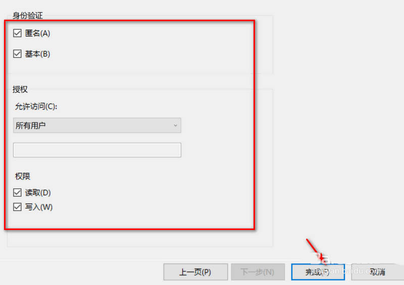 6、最后,勾选下匿名,基本,所有用户,读取写入,点击【完成】按钮即可。
