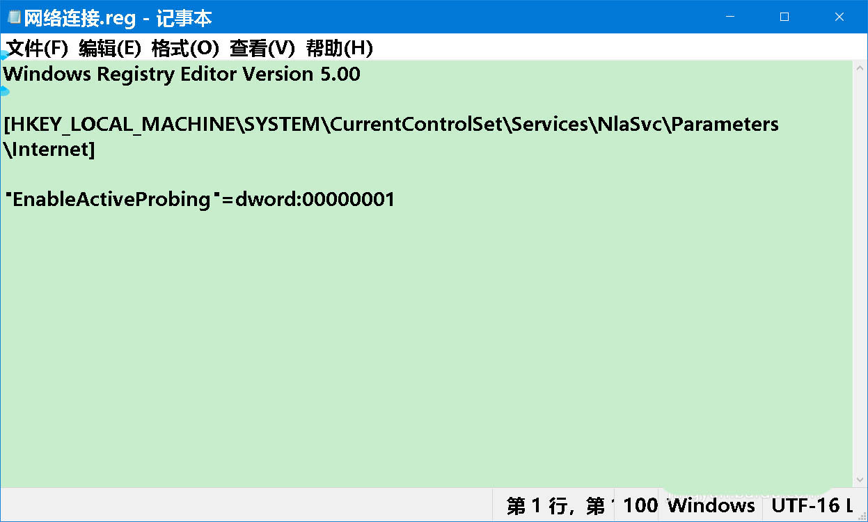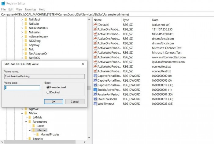 Windows Registry Editor Version 5.00 [HKEY_LOCAL_MACHINE\SYSTEM\CurrentControlSet\Services\NlaSvc\Parameters\Internet] "EnableActiveProbing"=dword:00000001