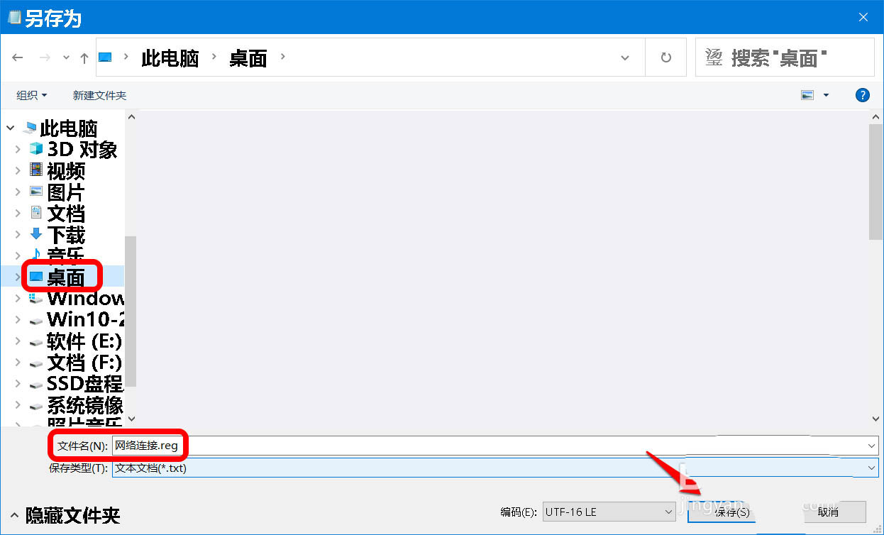 3、在另加存为窗口中,先点击窗口左侧的【桌面】,在文件名(N)栏中输入:网络连接.reg,再点击:保存;