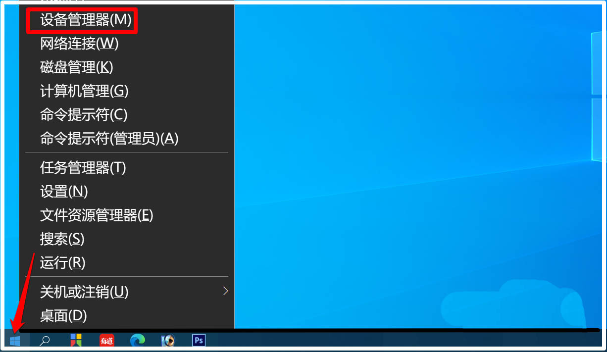 1、右键点击系统桌面左下角的【开始】-【设备管理器】;