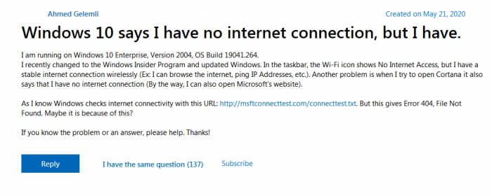 尽管显示这个错误的网络连接警告,但是用户依然可以在浏览器中正常访问网页。不过,Spotify、Cortana、Microsoft Store、Feedback Hub 等应用似乎都会根据 Windows 10 的网络状态才能访问服务器。因此,当你出现虚假的网络状态报告的时候,Spotify 和其他应用程序可能无法正常工作。