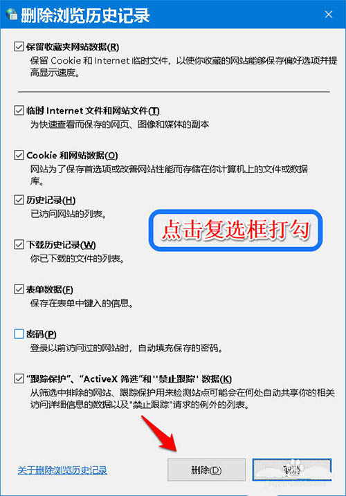 3、此时会打开一个删除浏览历史记录窗口,我们在需要删除的项目前打勾后再点击:删除;