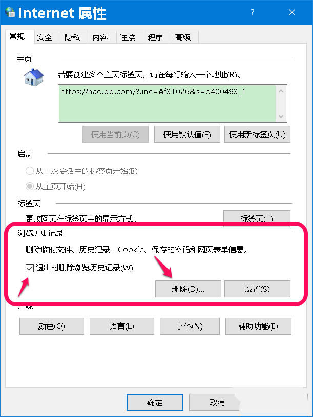 2、在打开的 Internet选项 属性窗口中,有一项 浏览历史记录 ,我们点击 ☑退出时删除浏览历史记录 前面的复选框使之打上小 【√】(如图),再点击:删除;