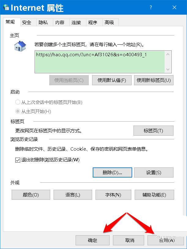 5、删除浏览历史记录后,回到 nternet 选项属性窗口,我们点击:应用 - 确定。