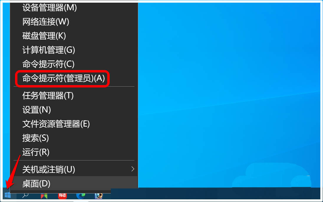 1、右键点击系统桌面左下角的【开始】-【命令提示符(管理员)】;