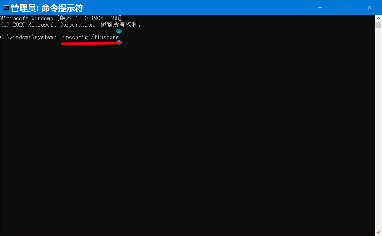 第二步:在管理员命令提示符窗口中运行 ipconfig /flushdns 命令刷新 DNS 解析缓存。