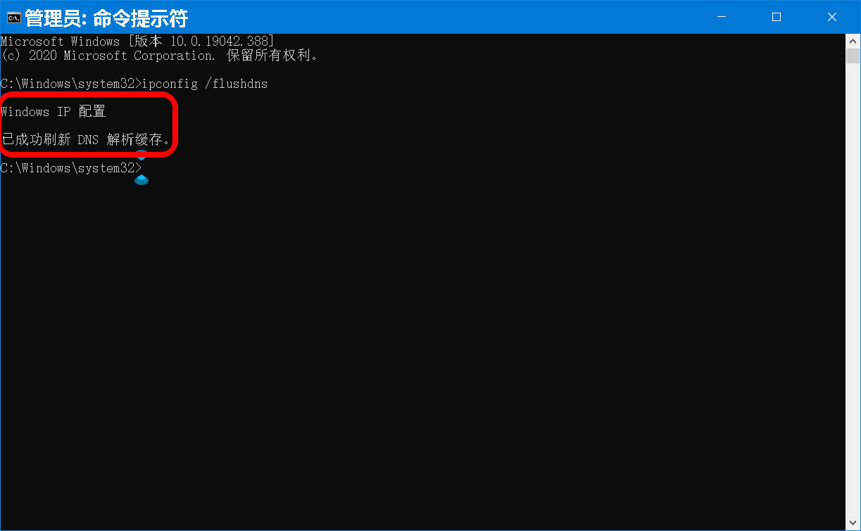 3、此时会显示:Windows IP 配置 已成功刷新 DNS 解析缓存。