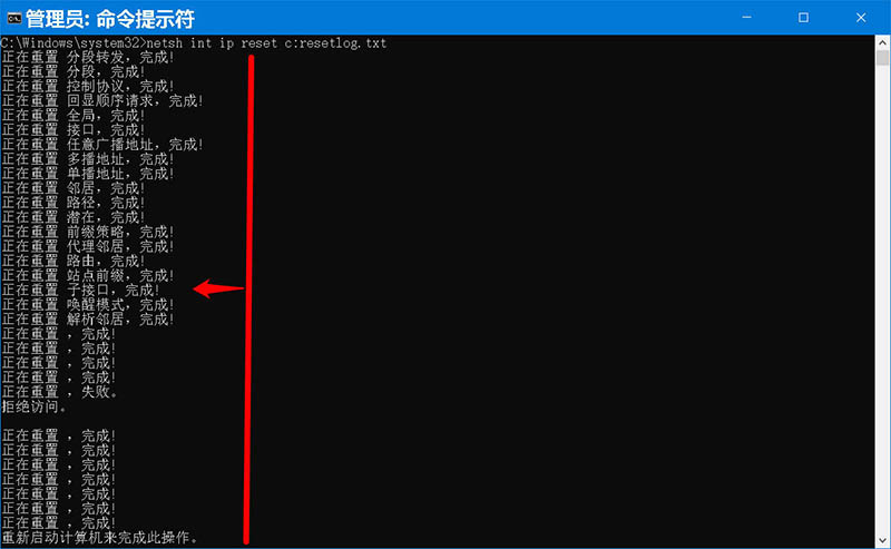 第三步:在管理员命令提示符窗口中运行 netsh int ip reset c:resetlog.txt 命令,修复TCP/IP协议。