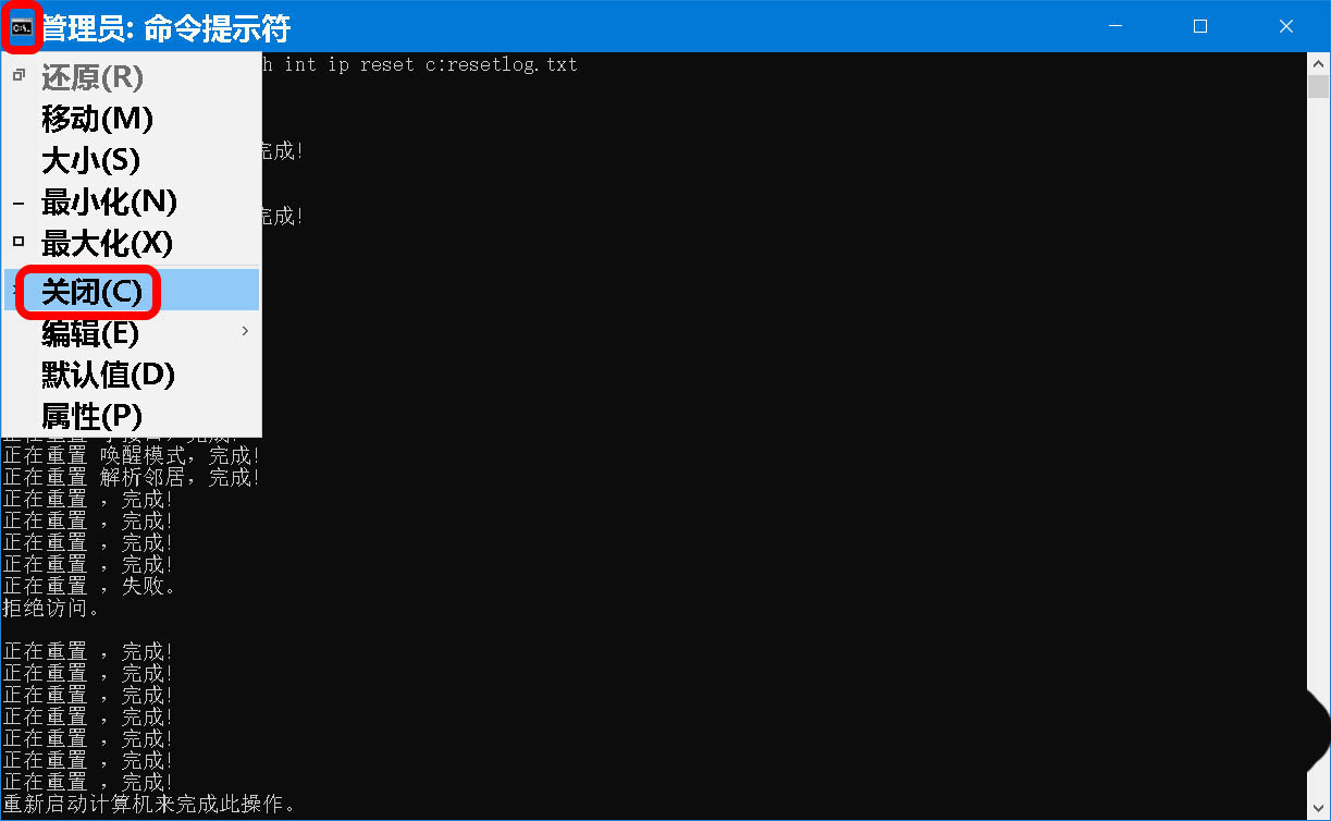 2、点击管理员命令提示符窗口左上角的【C:\】-【关闭】,退出管理员命令提示符窗口,重启计算机。