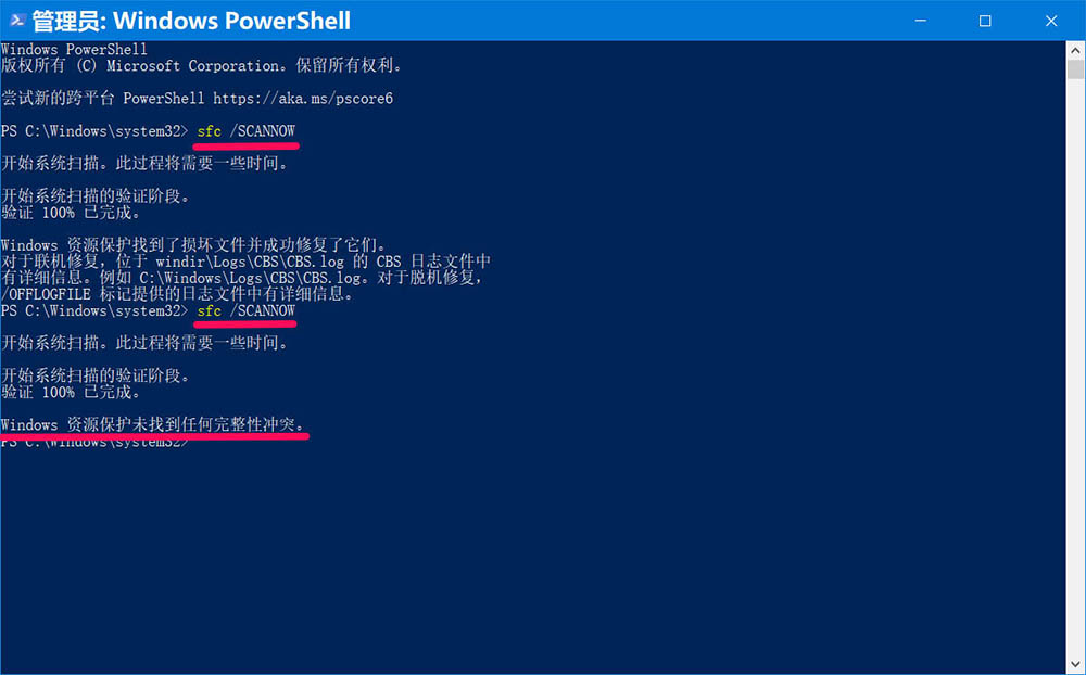 在Windows PowerShell(管理员)窗口中输入 sfc /SCANNOW 命令,按下键盘上的回车键,待其运行完成,显示 资源保护未找到任何完整性冲突 即可。