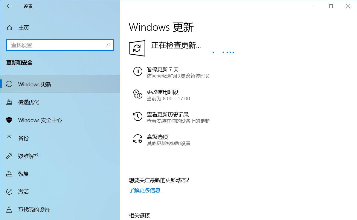 进入 设置 - Windows 设置 - 更新和安全 - Windows 更新,点击:检查更新 - 正在检查更新;