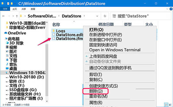进入系统资源管理器 - C:\Windows\SoftwareDistribution\DataStore,删除DataStore文件夹中的所有文件;