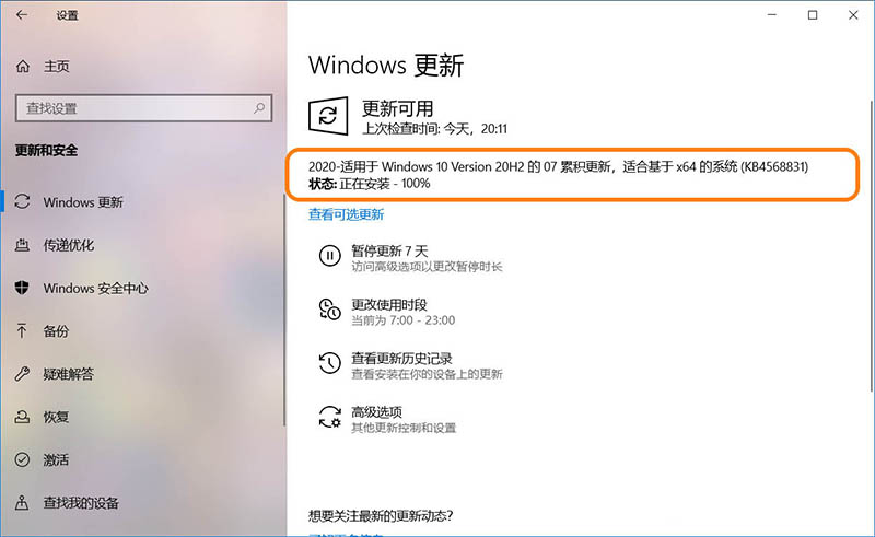 2020适用于 Windows 10 Version 20H2 的 07 累积更新,适合于 x64的系统(KB4568831)