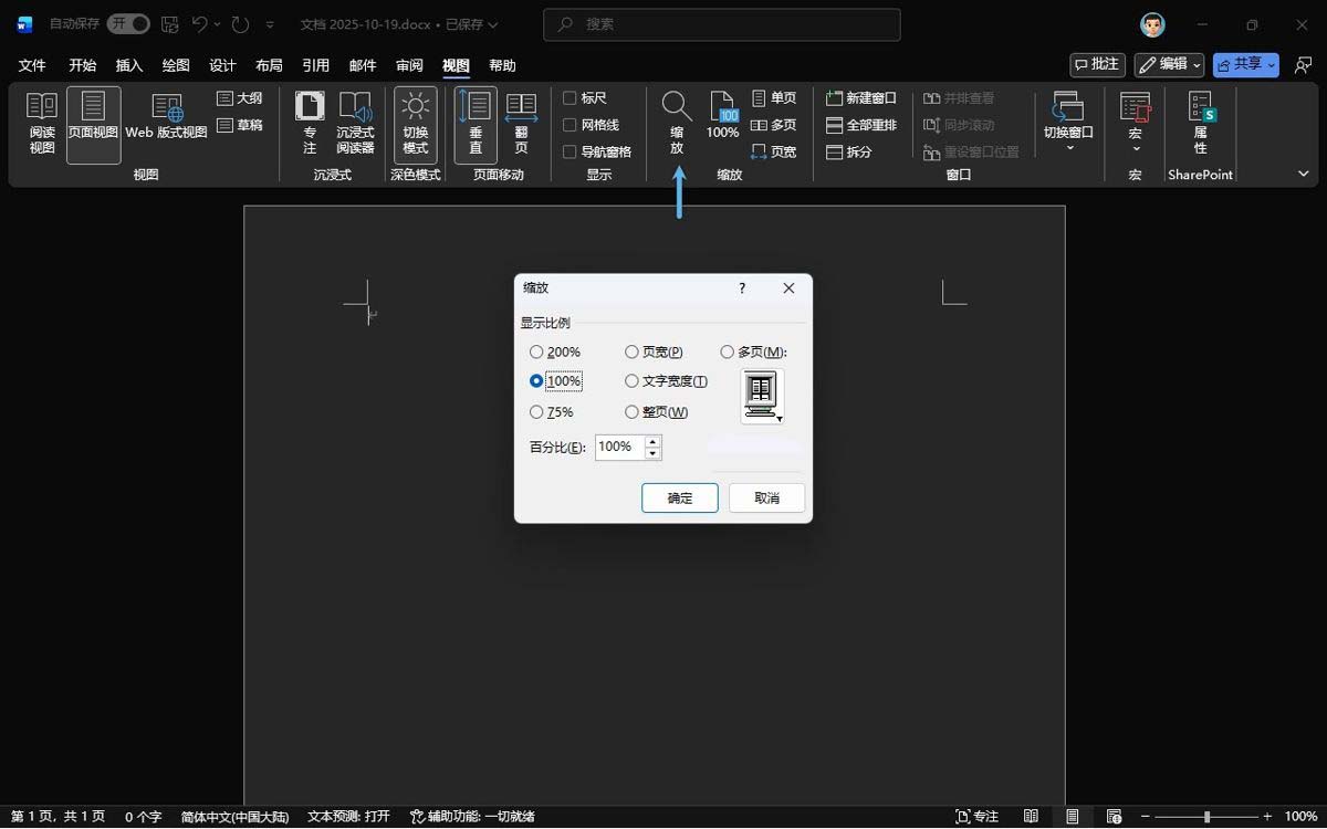 2、切换到「视图」选项卡,使用「缩放」工具来放大或缩小显示比例。
