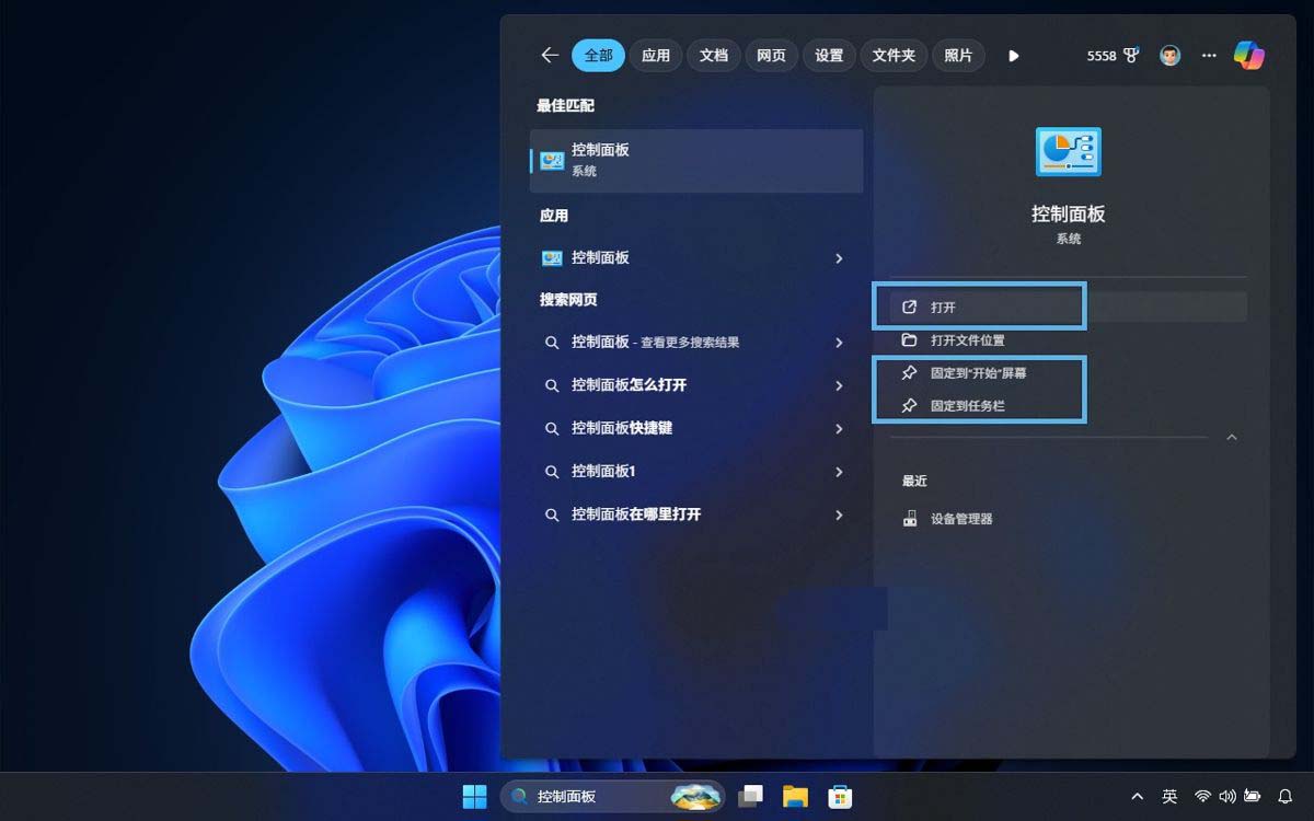 搜索并打开控制面板