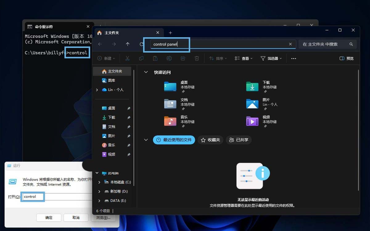 Windows + R快捷键,在弹出的「运行」对话框中输入control并回车。 - 在「文件资源管理器」的地址栏中,直接输入