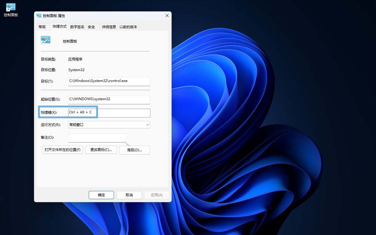 5、在「快捷方式」选项卡中,点击「快捷键」一栏,然后直接在键盘上按下你想要的组合键(例如 Ctrl + Alt + C),最后点击「确定」保存设置。