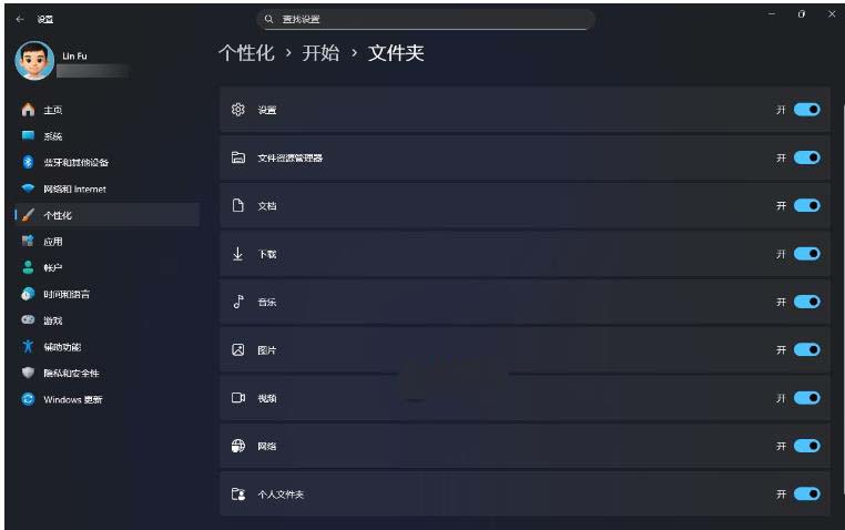 1、按Windows + I快捷键打开「设置」,依次进入「个性化」>「开始」>「文件夹」。