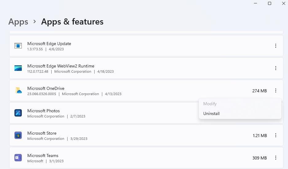 按照我们Windows 11中卸载应用程序指南的第二种方法,通过设置卸载OneDrive。然后在重新安装OneDrive之前重启Windows。