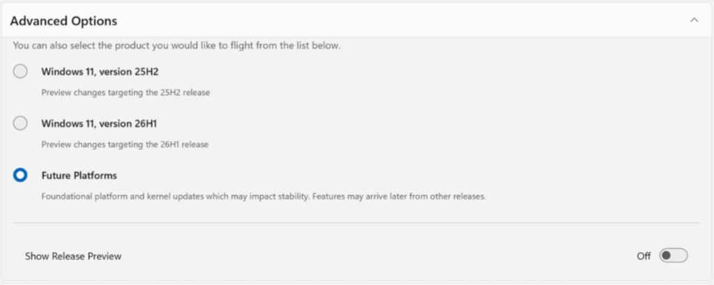 原 Canary 频道用户将根据版本号分流至 Experimental 频道下的未来平台或 26H1 版本。这些更新将在未来几周内开始向全体预览体验成员推送。