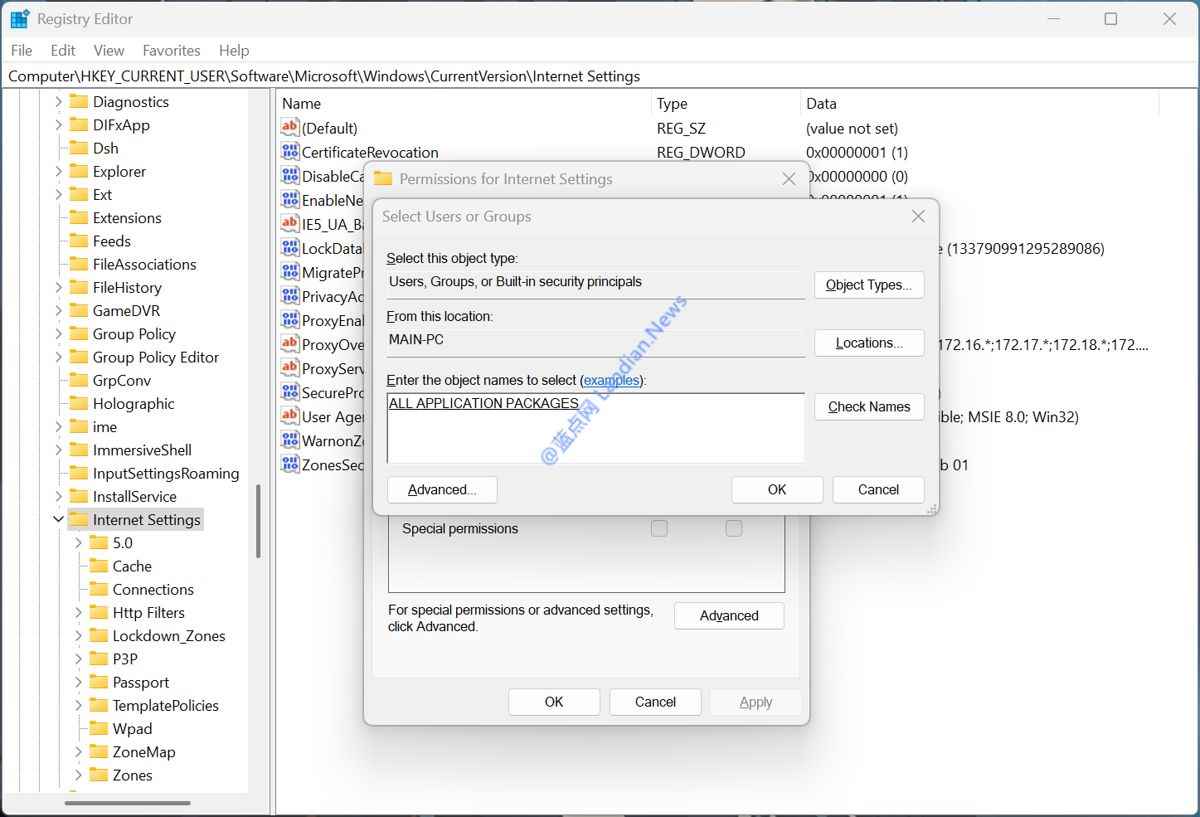 6. 在空白处粘贴 ALL APPLICATION PACKAGES 并点击右侧的检查用户名