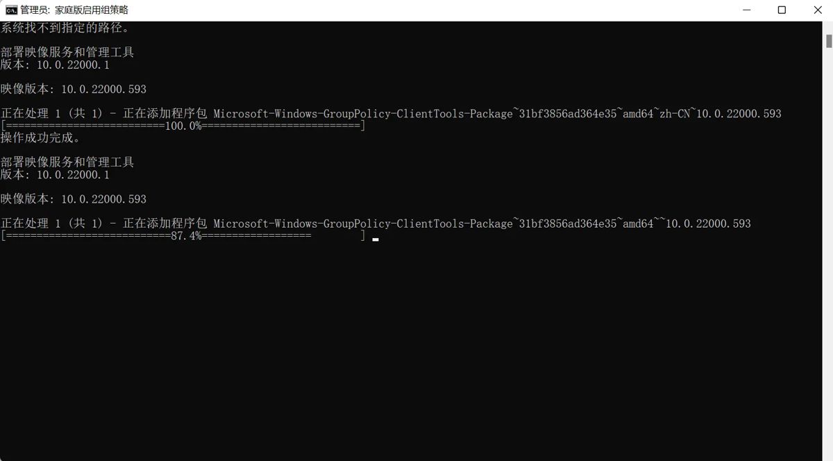 代码说明:通过dir命令遍历系统盘servicing目录,寻找组策略的配置包,找到后写入到gp.txt文件,接下来通过dism命令来安装组策略包。
