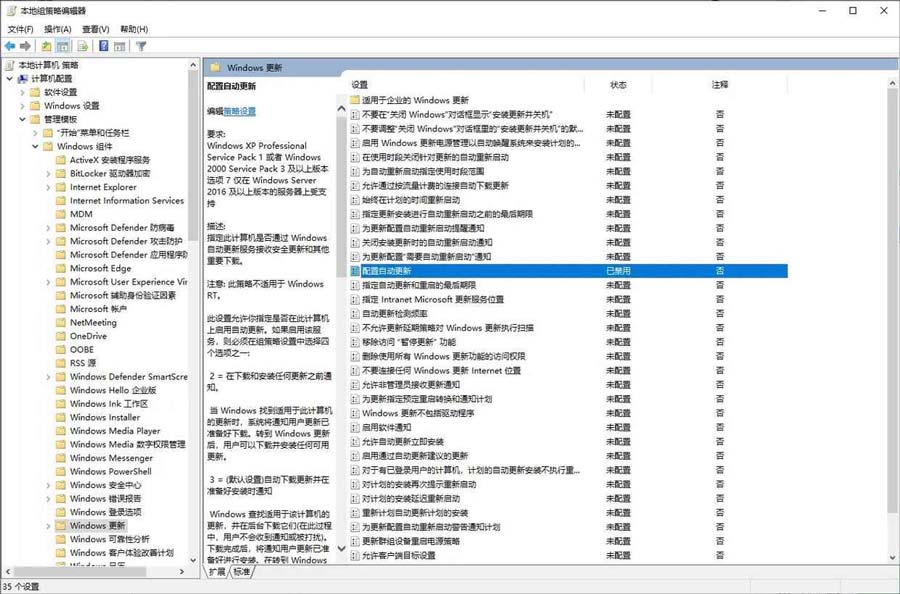 路径:计算机配置→管理模板→Windows组件→Windows更新