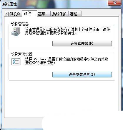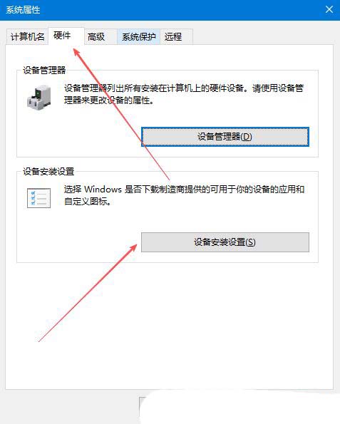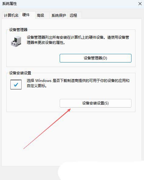- 切换到“硬件”选项卡,在其中找到并点击“设备安装设置”按钮。
