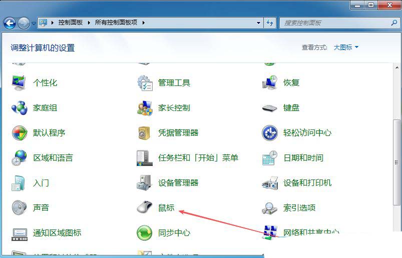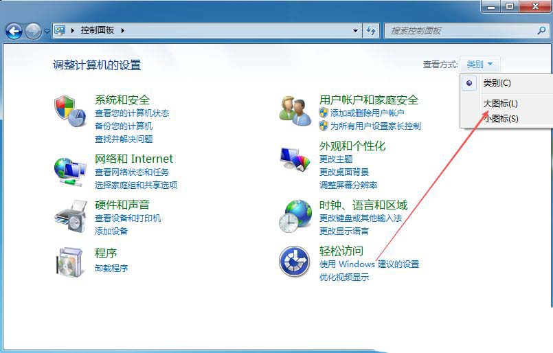 1、首先,打开Win7系统的控制面板界面,设置“查看方式”为“大图标”。