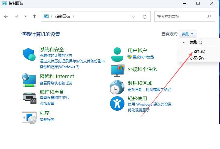 1、首先,打开Win11系统的控制面板界面,设置“查看方式”为“大图标”。