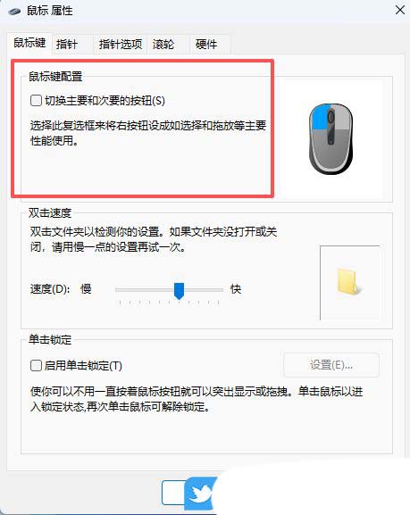 4、鼠标 属性窗口中,默认不勾选切换主要和次要的按钮,但是如果大家需要调换鼠标的左键和右键,勾选后,直接点击确定即可;
