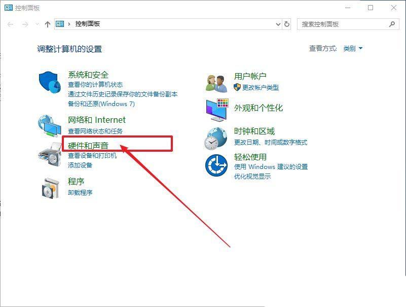 2、控制面板窗口中,切换到类别查看方式,然后点击硬件和声音;